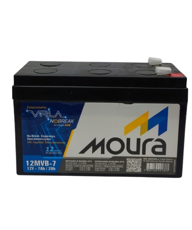 Moura é a Bateria com maior durabilidade e vida útil do mercado. Confiabilidade e segurança no uso. Para Nobreak, Sistema de Segurança e muitas outras aplicações, esta bateria de 12V 7Ah com tecnologias VRLA AGM é a escolha ideal, sendo que 90% das baterias utilizadas em No-Breaks no Mundo são do tipo AGM.